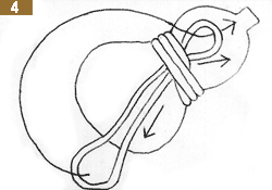 矢印の方向に紐を引っ張って締めます。次に下の輪を上の輪の中に通して下さい。