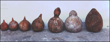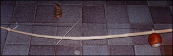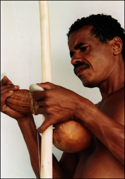 ビリンバウは、楽弓(Musical Bow)の一種に属し、その中でも、特に原始的な構造を持つ楽器の一つです。(写真2)楽器は、弓部分と共鳴器部分からなり、それにカシシという副楽器を合わせて演奏することもあります。弓部分は木で、通常最も使用するのはビリーバですが、他にマッサランドゥーバ、カンディア、タイポカ、カンガルー、パウ・ダルコ(いずれも日本語訳なし)などを使用することもあります。ブラジル以外の国で作られる場合は、代用に、竹を使用することが頻繁にありますが、音が弱冠細く感じられる程度で、逆に繊細な音を発します。日本で手に入る、ブラジルからの輸入品は、ビリーバの他に、マッサランドゥーバ、タイポカなどが多いようです。共鳴器は瓢箪で、その大きさの違いで、音の高低を選ぶ事が出来ます。