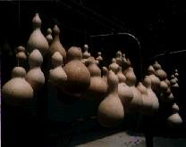 After finishing my gourds, I make faucets and put tassels and strings on them. Then they are done! Good materials are needed for producing good works. The gourds must have plenty of seeds inside, nipples on top, beautiful colors on the outside, and good shapes.